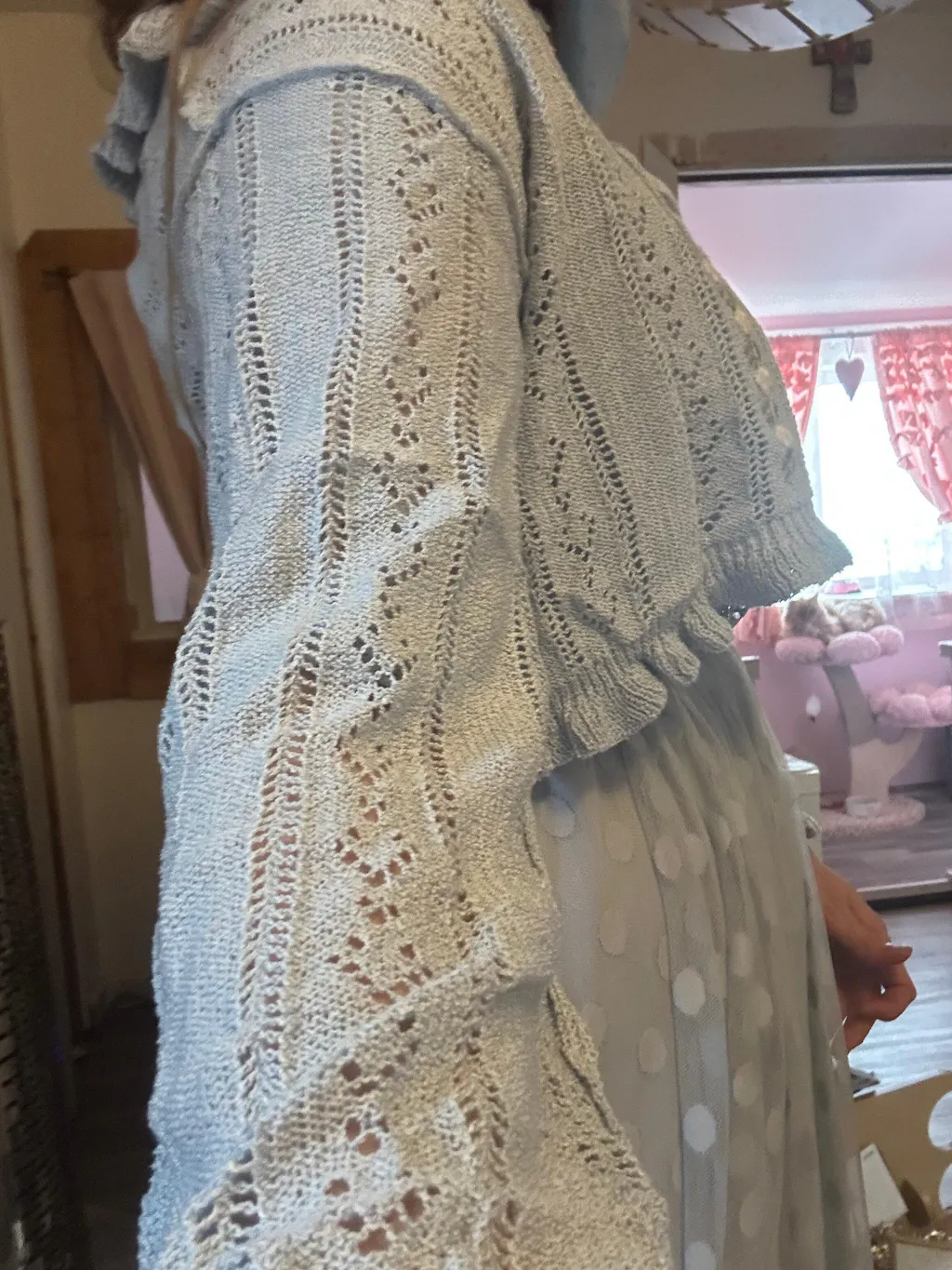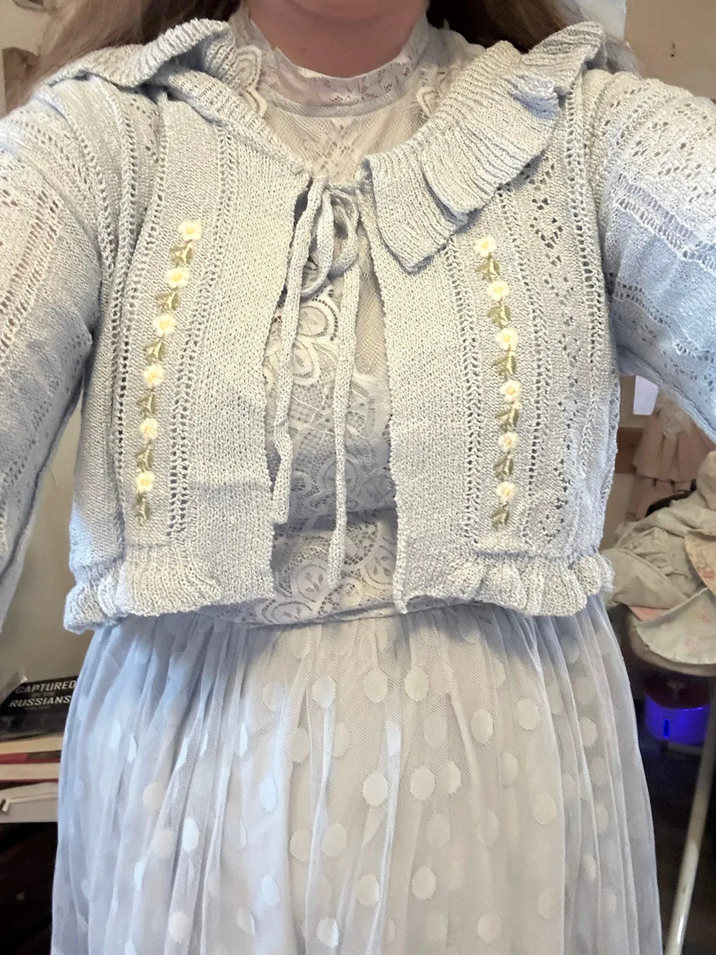 Add a soft, feminine touch to your wardrobe with this baby blue medium-weight knit cardigan, featuring delicate ruffle details along the collar, cuffs, and open front with embroidered floral accents. Crafted from a breathable cotton-blend knit, this piece layers beautifully over camis, dresses, or blouses—perfect for effortless transitions between seasons.