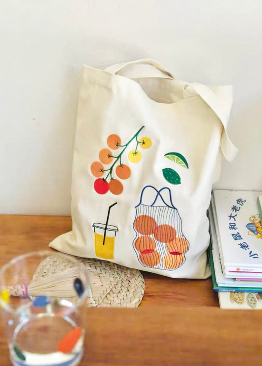 Cozy Morning Embroidered Canvas Tote Bag – Coffee, Croissant & Kitty