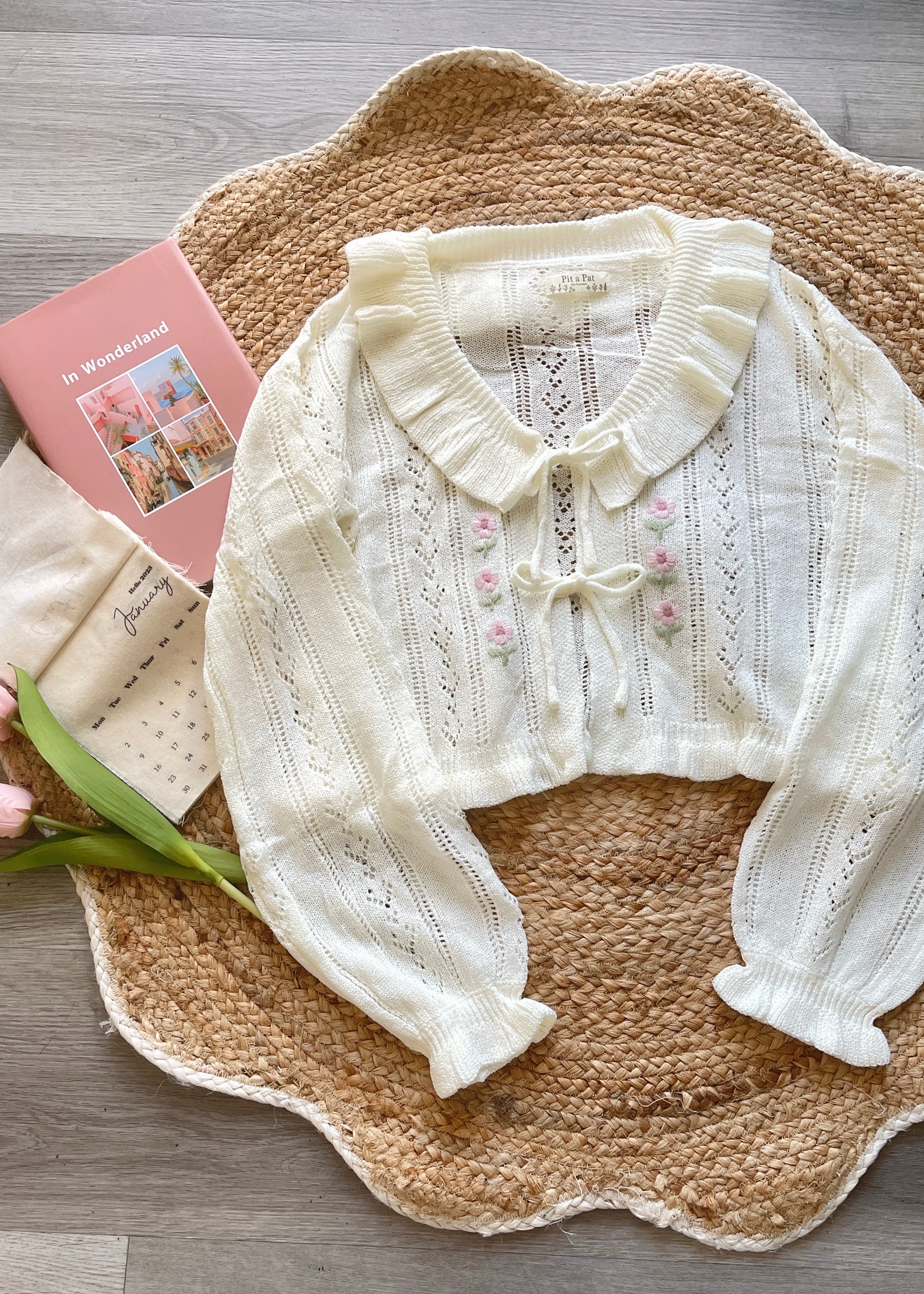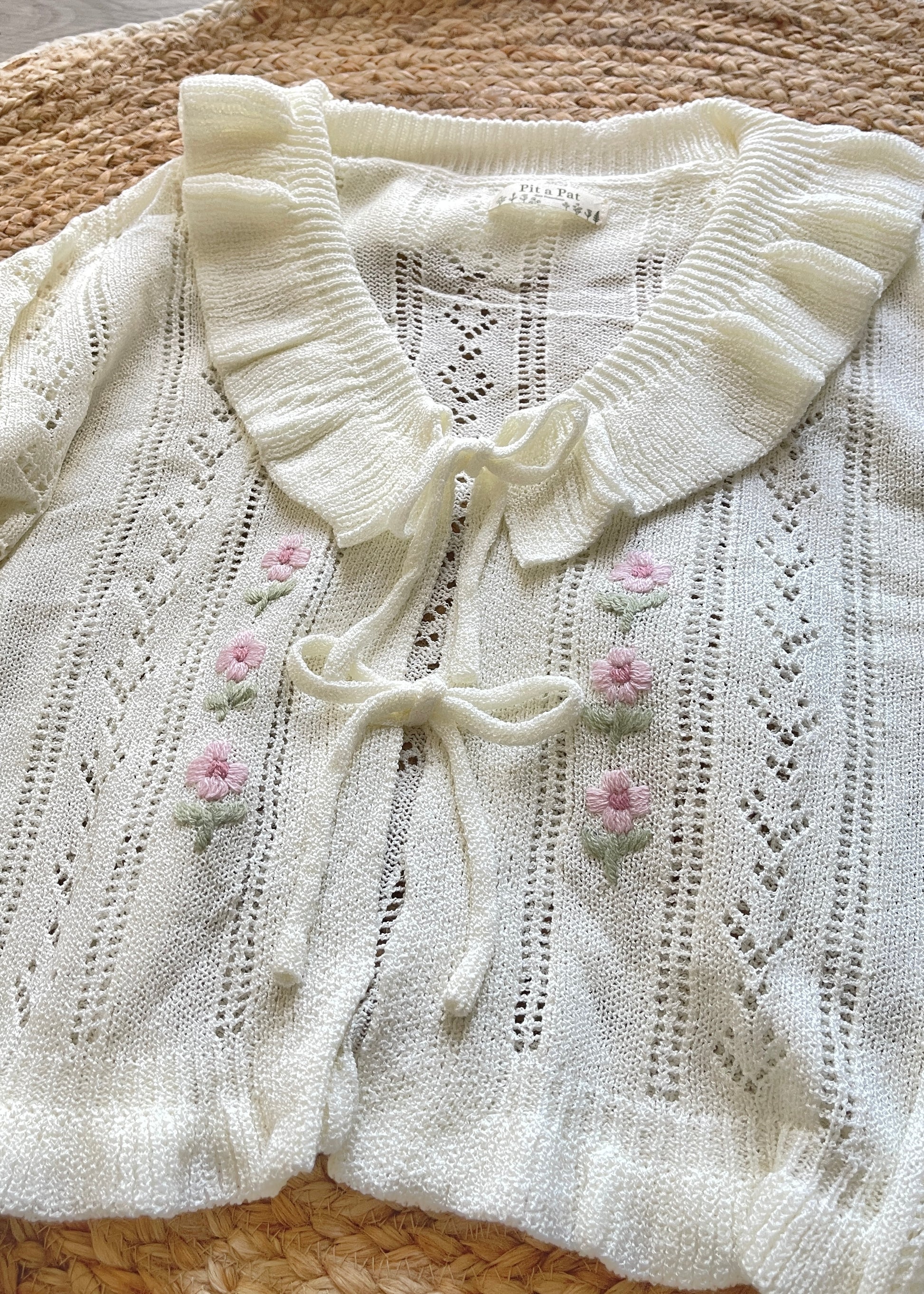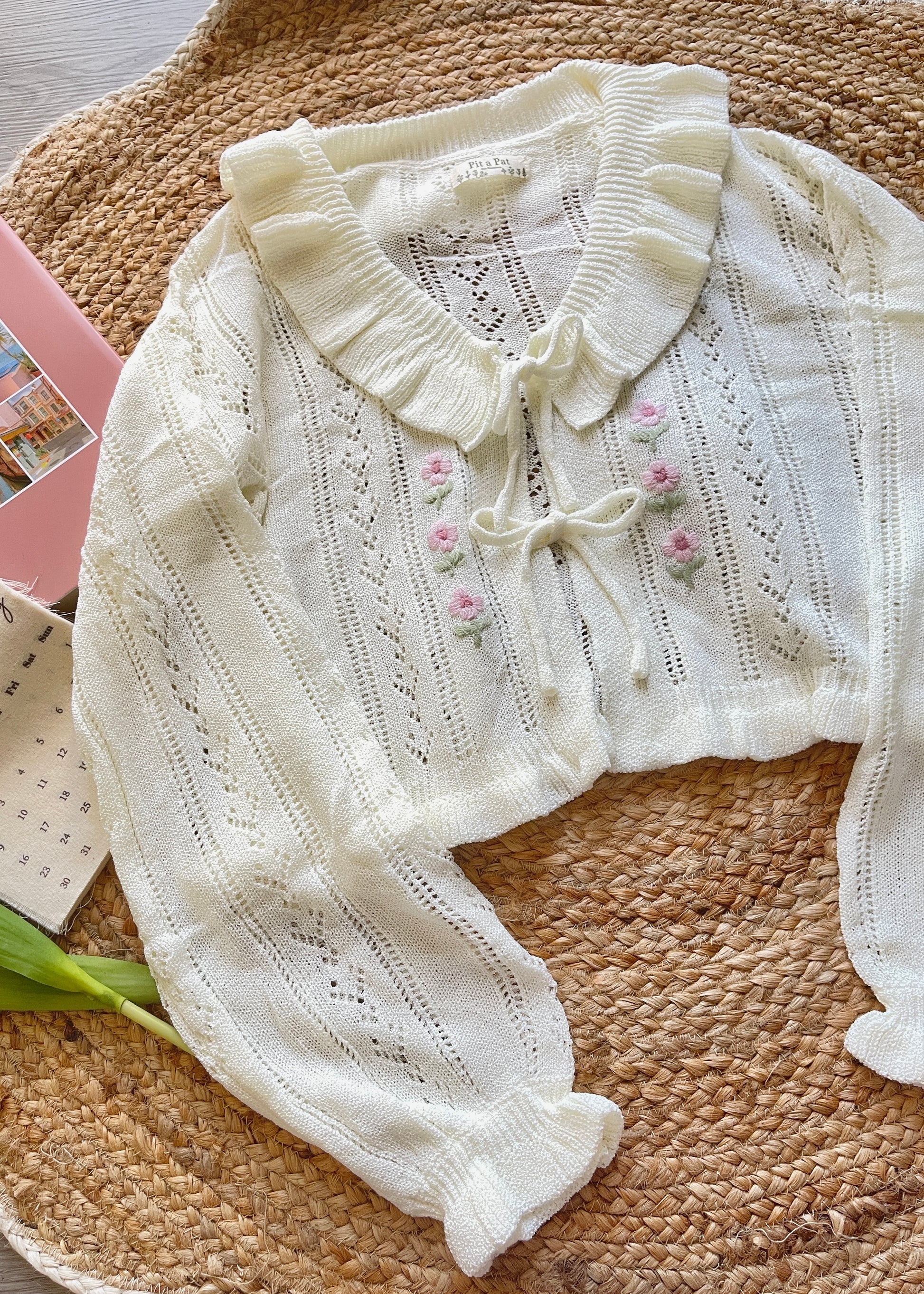 Add a soft, feminine touch to your wardrobe with this cream white medium-weight knit cardigan, featuring delicate ruffle details along the collar, cuffs, and open front with crochet tulip accents. Crafted from a breathable cotton-blend knit, this piece layers beautifully over camis, dresses, or blouses—perfect for effortless transitions between seasons.
