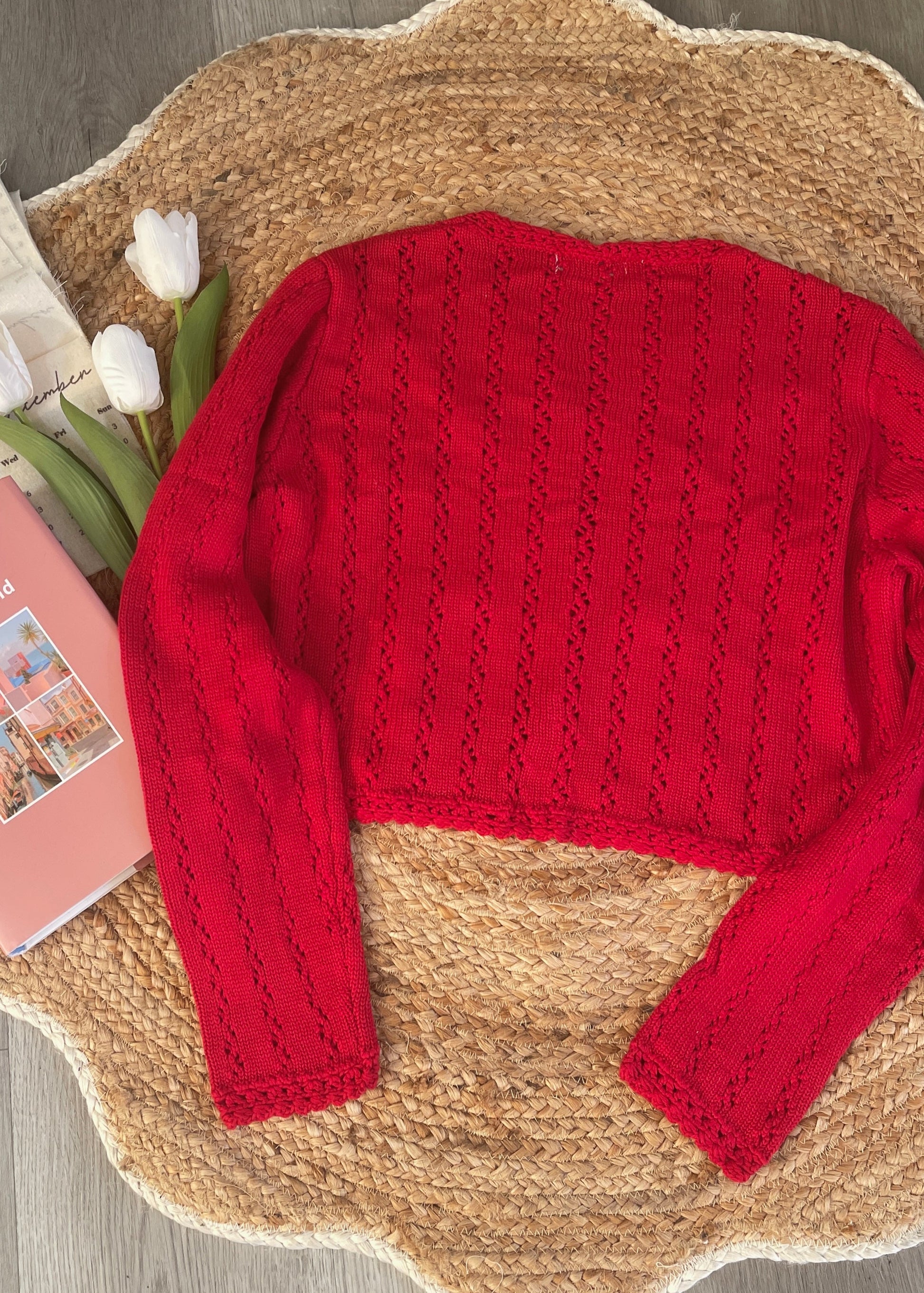 Add a soft, feminine touch to your wardrobe with the Balletcore Knit Cardigan. This medium-weight cotton knit features delicate scallop trim, 3D bow detailing, and custom-made gold bear buttons/ red heart buttons, offering a vintage yet timeless accent. Designed with a boxy fit, it provides enough room for both everyday routines and special outings. Layer it effortlessly over camis, dresses, or blouses for season-to-season versatility.