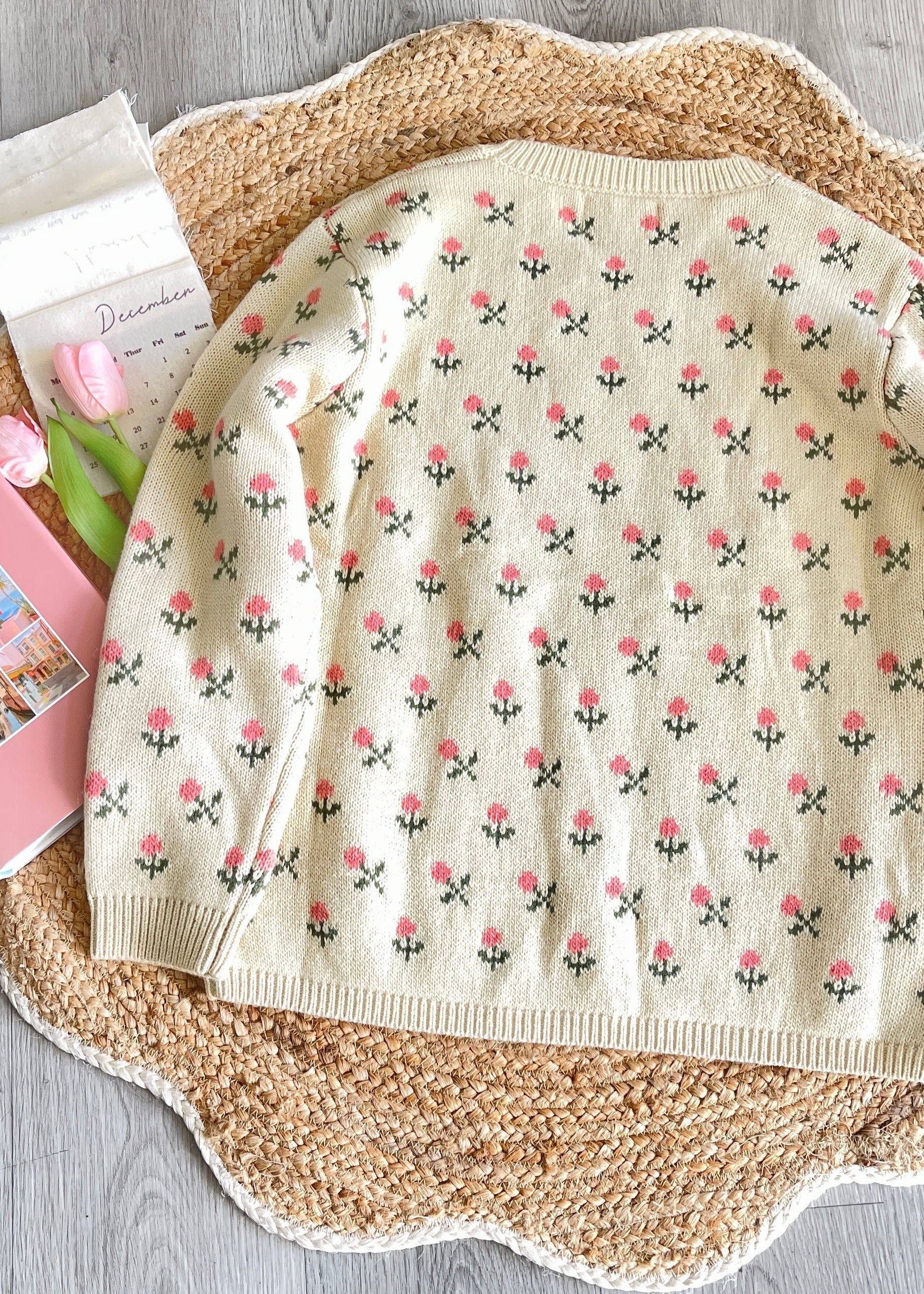 Stay warm and cozy in the Mr. Bunny Fantasy Oversized Wool Blend Cardigan, featuring a classic round neckline and an adorable bunny motif at the center front, accented with a delicate allover mini pink tulip pattern. This charming cardigan adds a vintage, cute, cottagecore touch to any outfit, making it a playful and stylish addition to your wardrobe.