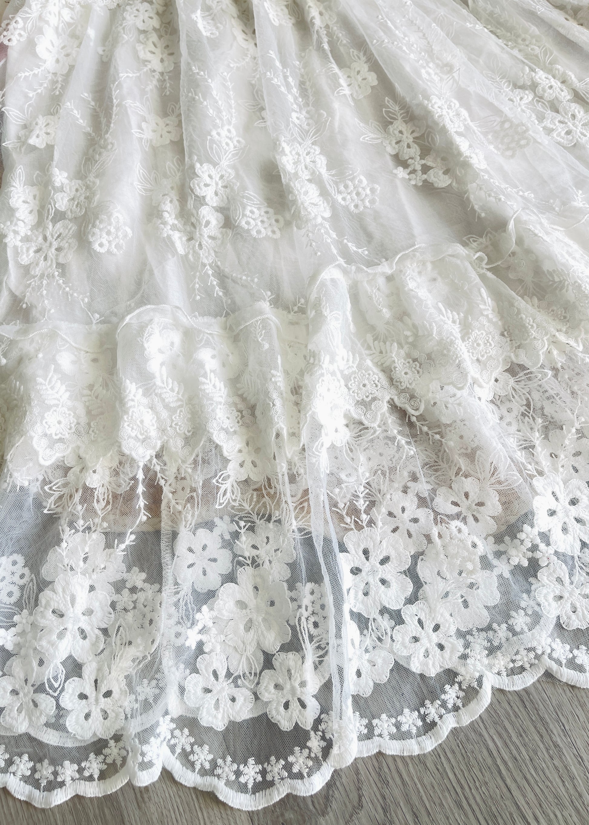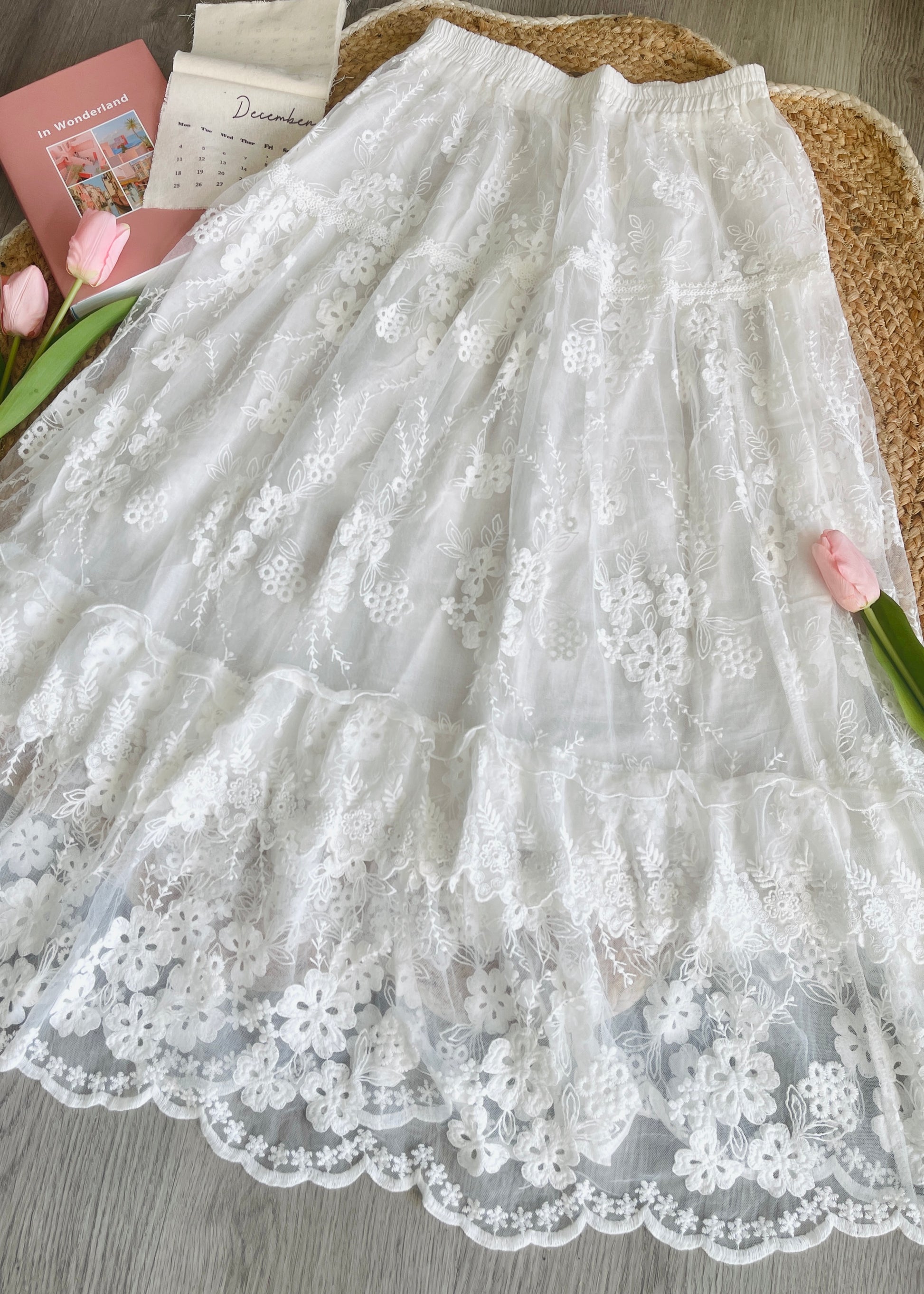 Fairycore White Lace Floral Embroidery Scallop Hem Maxi Skirt